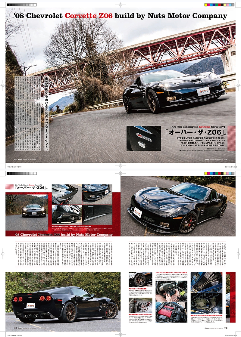 ナッツモーターカンパニーが制作したC6コルベット Z06がエーカーズで4ページに渡って紹介されました。エクステリアにはZR1ライクなカーボンエアロを装着。ホイールはHRE。エンジン本体はノーマルですが、排気系を変更。ディアブロスポーツのデバイスを使って、ECUのプログラムをナインレコードのオリジナルデータに書き換えています。また、足回りには現在開発中のオリジナル車高調キットを装着しています。