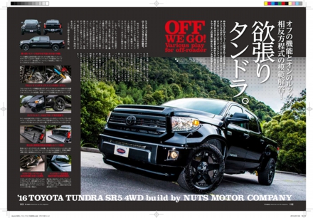 ナッツモーターカンパニーが制作した2016年型USトヨタ タンドラ SR5のカスタムカーがエーカーズでで紹介されました。エクステリアは「ハニーD」のオーバーフェンダーキットを装着。ホイールはKMCロックスター。足回りはフロントがローダウンサス&ダンパーの取り付け位置の変更、リアはフリップダウンキットでローダウンしています。オフロードライクなエクステリアでありながら足回りはシティユースで使い勝手の良いちょい下げという珍しい仕様ですが、存在感は抜群です。
