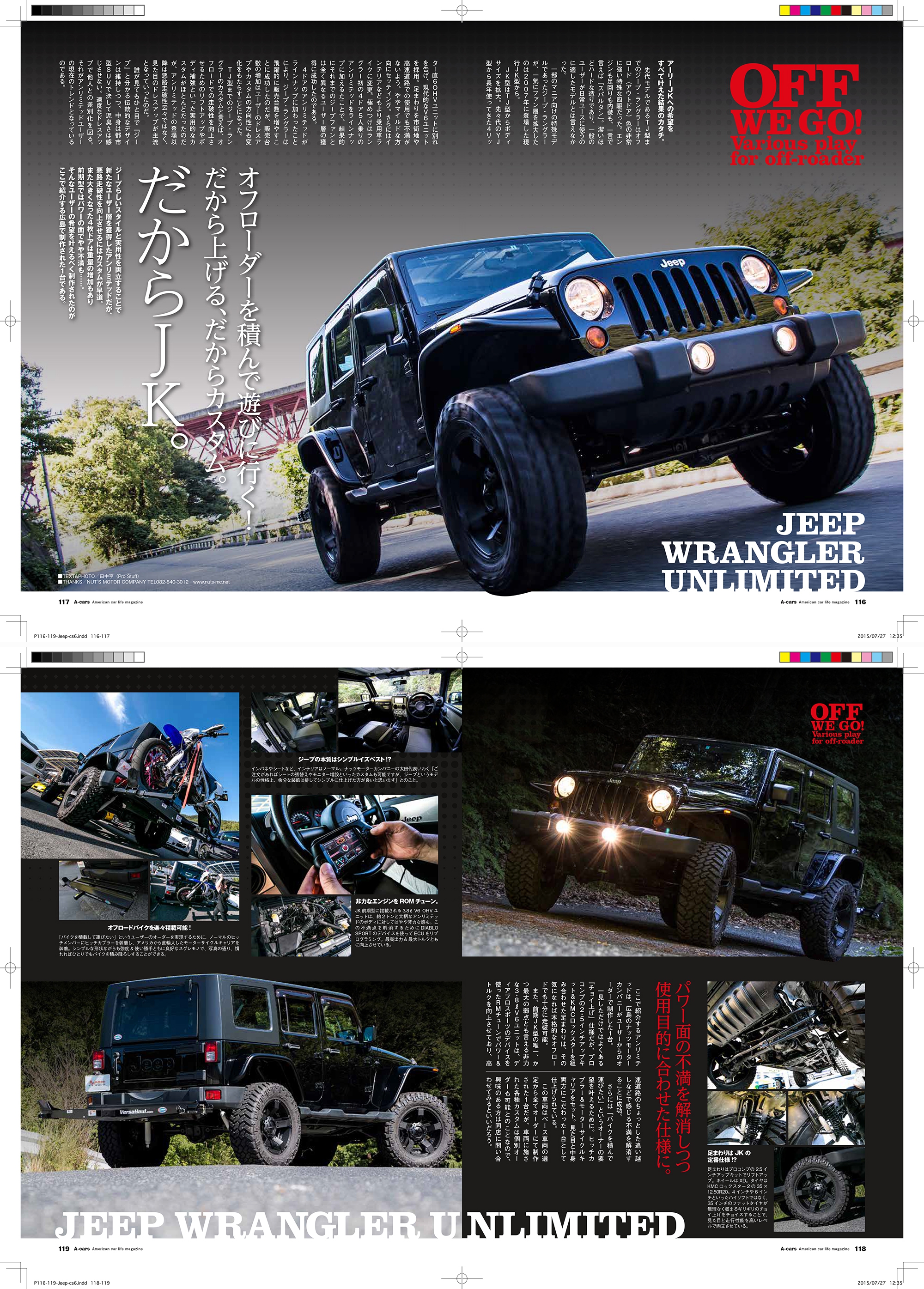 ナッツモーターカンパニーが制作したWRANGLERがエーカーズで4ページに渡って紹介されました。2.5インチリフトアップしディアブロスポーツのデバイスを使ってパワー&トルクUPさせ、モーターサイクルキャリアを装備しています。