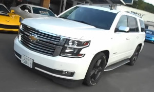 第四世代のタホの初年度モデルです。2017年の春に、広島のナッツモーターカンパニーがアメリカから中古並行輸入した車両。国内1オーナーで、ショートコイルスプリング(ローダウンサス)&ショートストロークのダンパーで車高が下げられている他、マフラーもギブソンに交換されていますが、ノーマルパーツを保管しているので元に戻すことも可能だそうです。