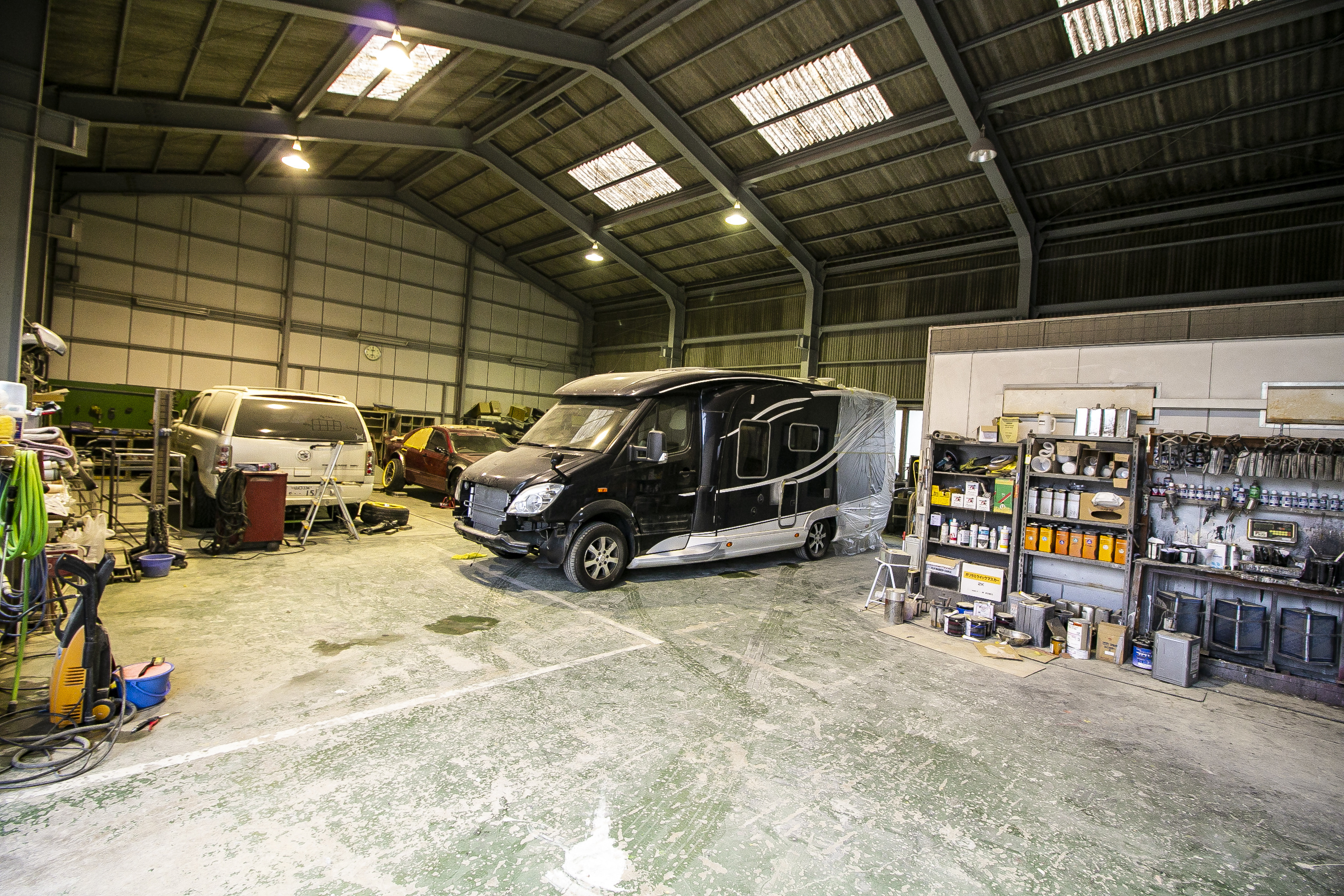 陸運局認証の自社工場には「新基準ライトテスター」「サイドスリップテスター」「コーナーウエイトゲージ」「タイヤチェンジャー」「エアコンガス交換機」「クリーンルーム」など、車両の修理、整備、チューニング(調整)に必要な様々な設備を完備し、納車整備や車検に活用しております。